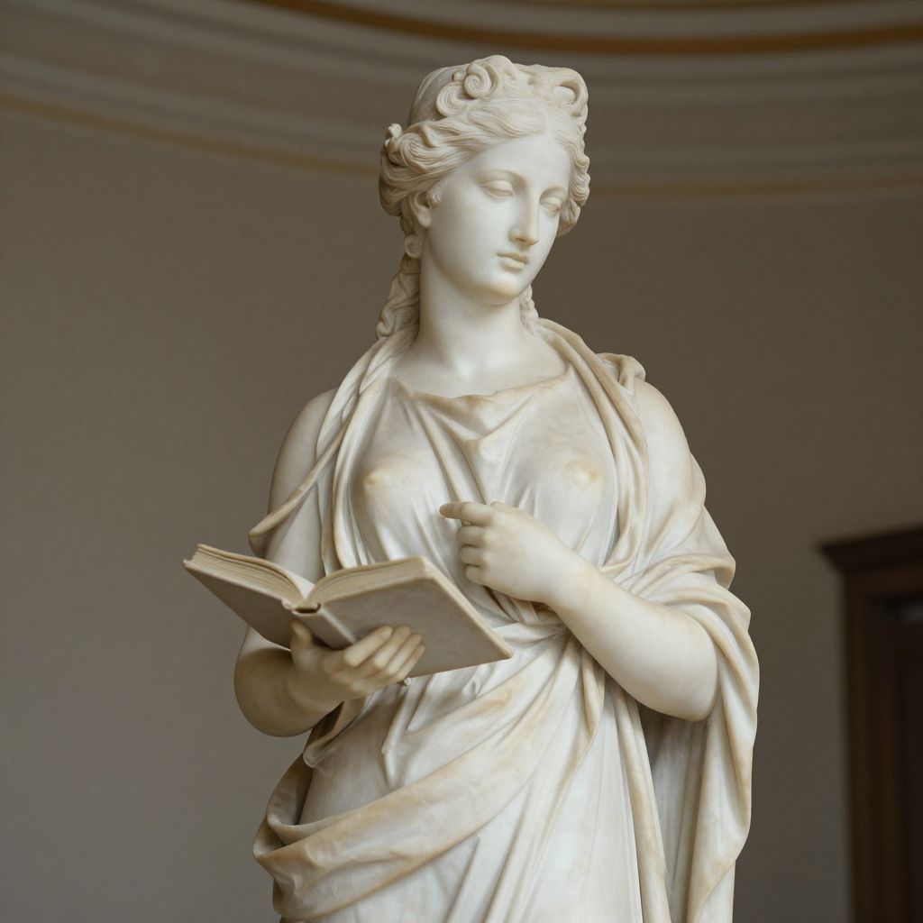 Classical marble statue of a woman with intricately styled hair, draped in flowing robes, holding an open book, her serene expression captured in eternal contemplation against a softly lit indoor setting.