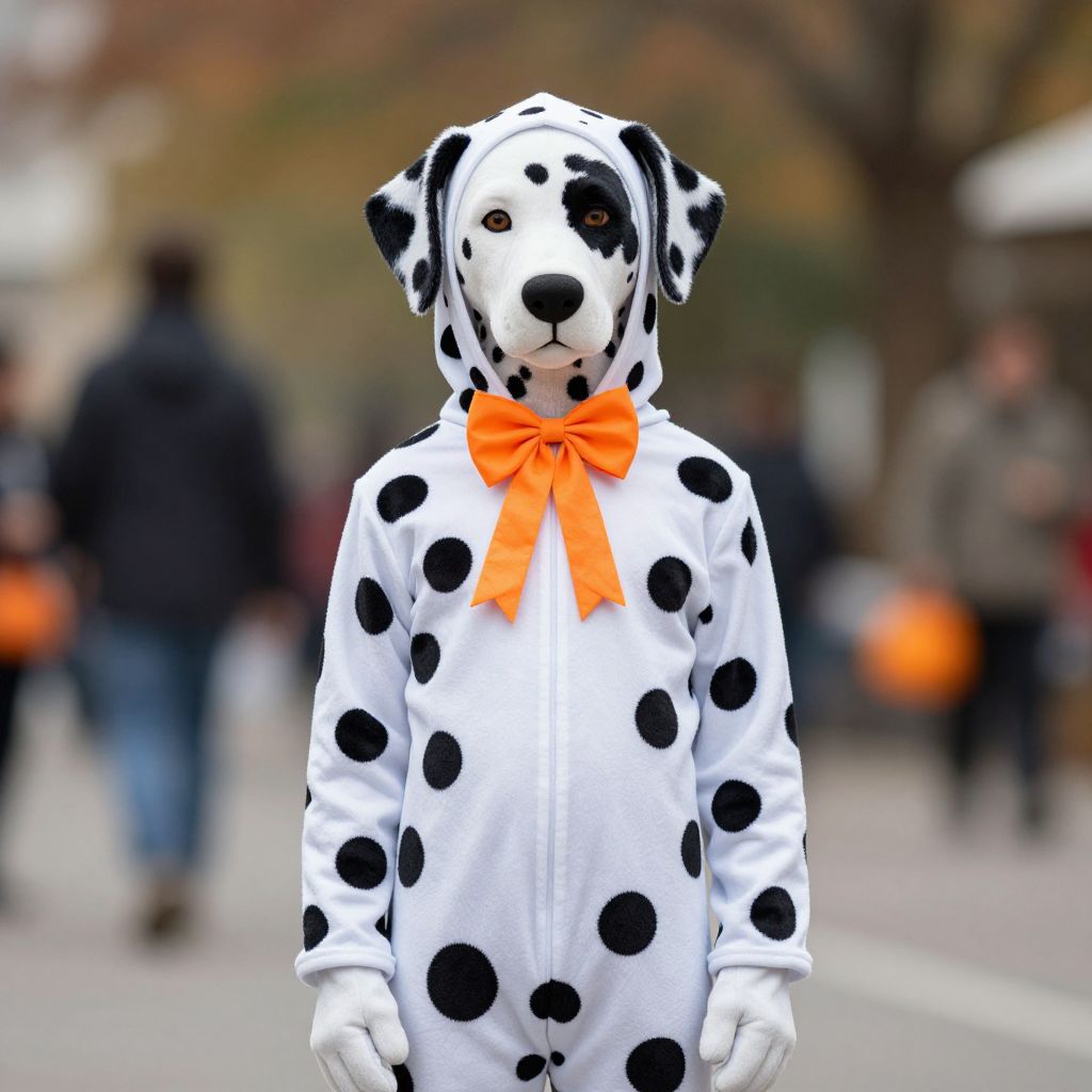 Photograph of a person dressed in a Dalmatian costume with a white, black-spotted hood and outfit, featuring a large orange bow tie at the chest. The person has a mask with a Dalmatian face and black ears. The background is blurred, showing an outdoor setting with people in dark clothing, some carrying orange bags. The scene suggests a festive or costume event. The costume is bright and eye-catching, contrasting with the muted, autumnal background. The image has a shallow depth of field, focusing on the Dalmatian costume while blurring the background.