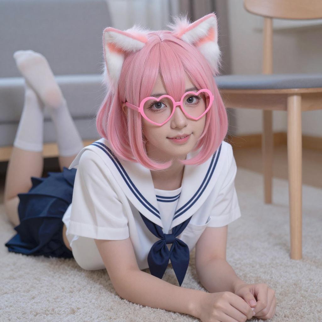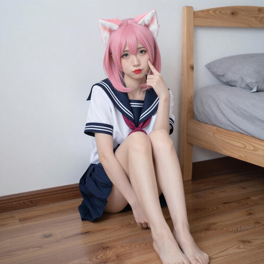 Photograph of a blonde anime-style girl with fox ears, lying on a wooden floor, wearing a white blouse, red ribbon, brown plaid skirt, and black thigh-high socks. She holds a pen and paper, surrounded by scattered documents. Her legs are raised, and she gazes up with a playful expression.