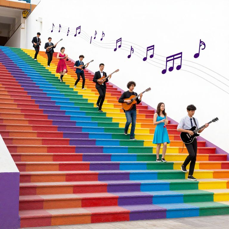Photograph of a rainbow-colored staircase with seven musicians ascending. The stairs, vividly painted in red, orange, yellow, green, blue, and purple, create a visually striking gradient. Musicians, dressed in formal and casual attire, play various string instruments. A woman in a blue dress stands out among men in black suits and a man in a white shirt and suspenders. Musical notes float above, enhancing the musical theme. The background is white, contrasting with the colorful stairs and musicians, creating a vibrant, energetic scene. The image is bright and cheerful.