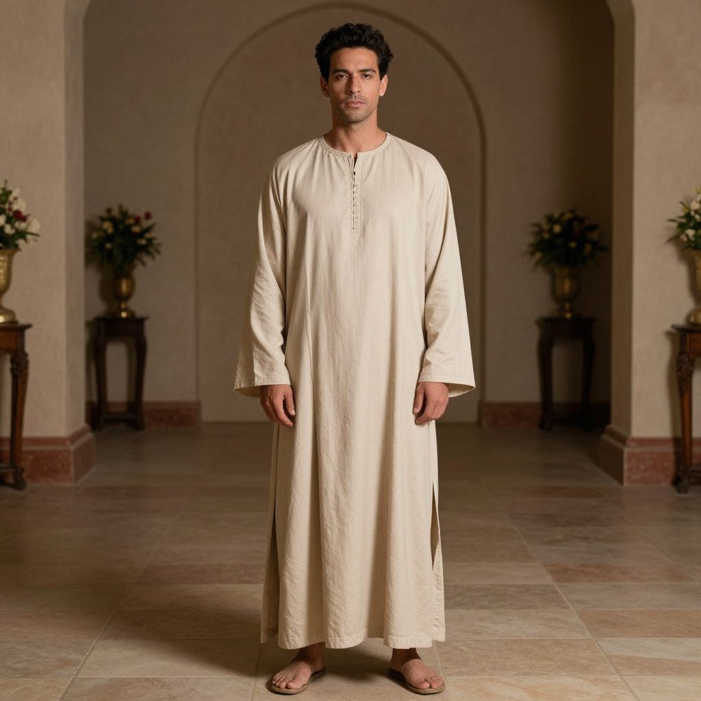Outfit Beige Costume, man in a long robe standing in a hall