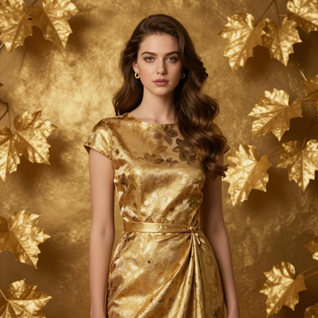 Gold themed dress, photorealistic portrait of a beautiful young woman with wavy brown hair, wearing a gold metallic dress with floral patterns, standing in front of a ured golden leaf background, soft lighting, elegant and sophisticated style, golden earrings, calm expression, medium shot, detailed ures, high-quality digital photography