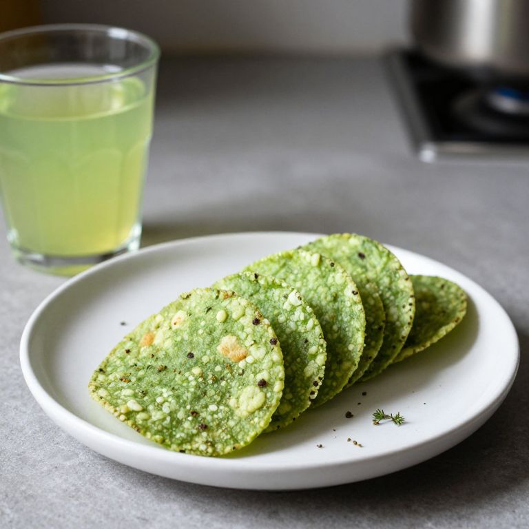 Photograph of a white plate with five green, textured corn tortillas sprinkled with black pepper and herbs, positioned slightly to the right on a gray, textured countertop. Behind the plate, to the left, is a clear glass filled with a light yellow-green liquid. In the blurred background to the right, there is a stainless steel pot on a stovetop. The image has a high contrast with bright highlights and soft shadows, emphasizing the fresh, vibrant colors of the tortillas and the drink.