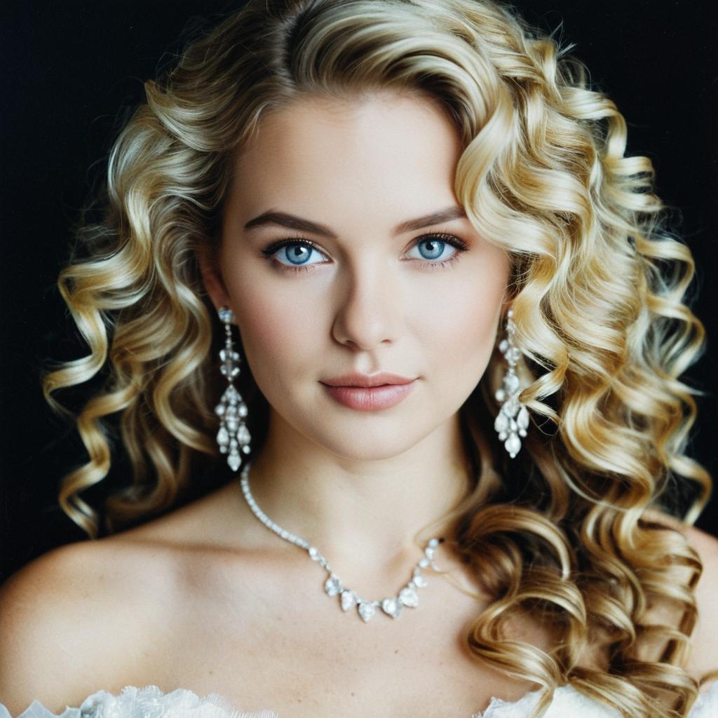 Portrait of a young blonde woman with long, voluminous curly hair, blue eyes, and natural makeup. She is wearing a white off-shoulder dress, diamond earrings, and a matching diamond necklace against a dark background.