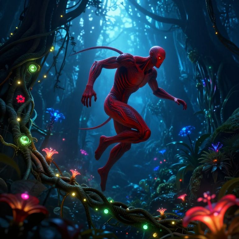 Digital artwork of a red, faceless, muscular alien leaping through a luminous, bioluminescent jungle with glowing flowers and alien eyes.