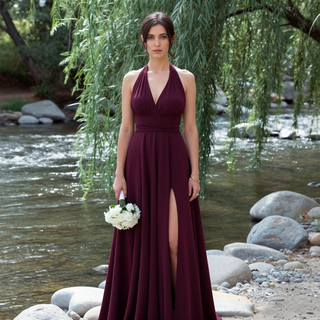A Willowy woman, classic elegance, burgundy floor-length gown, halter neckline, sleeveless, high slits, cinched waist, subtle A-line skirt, holding a small bouquet of white flowers, minimalist gold bangle, neutral makeup, hair pulled back simply, at a Wonderland riverbank with shimmering stones, technicolor analog film stock. Sexy. Pretty face and beаutiful eyes. Big breasts