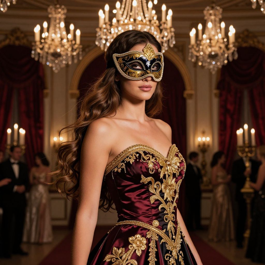 A stunning lady at a luxurious masquerade ball, wearing a lavish silk mask gown with intricate gold embroidery, her face hidden beneath a detailed, ornate velvet mask that gives a sense of mystery and elegance, her long flowing hair cascading over one shoulder, set in a grand, dimly lit ballroom with candlelight reflections on crystal chandeliers and elegant red velvet curtains.