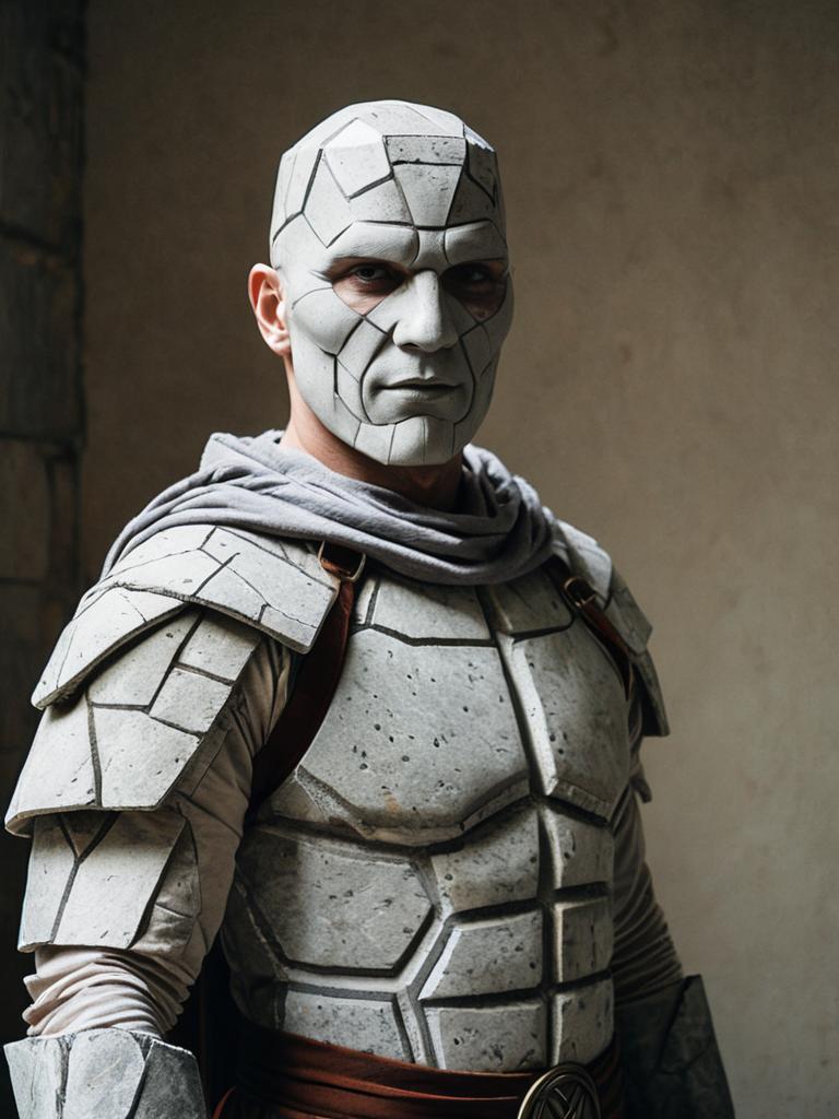 Portrait of a man wearing a detailed stone man cosplay costume. The costume features segmented stone-like armor plates covering the head, shoulders, chest, and arms, with a worn grey scarf around the neck and a brown leather belt. The realistic design includes etched lines and textures resembling cracked stone, creating a strong and stoic appearance.