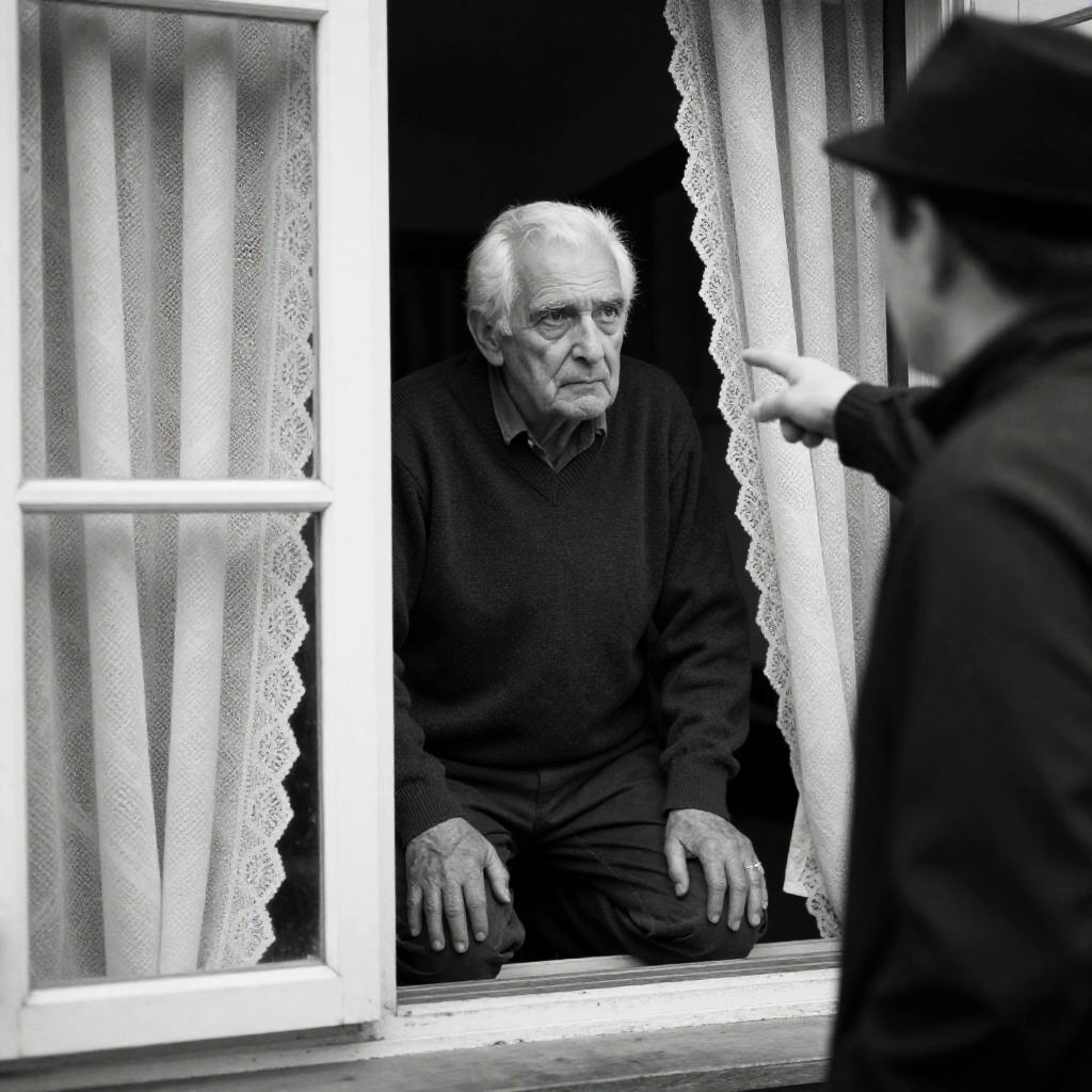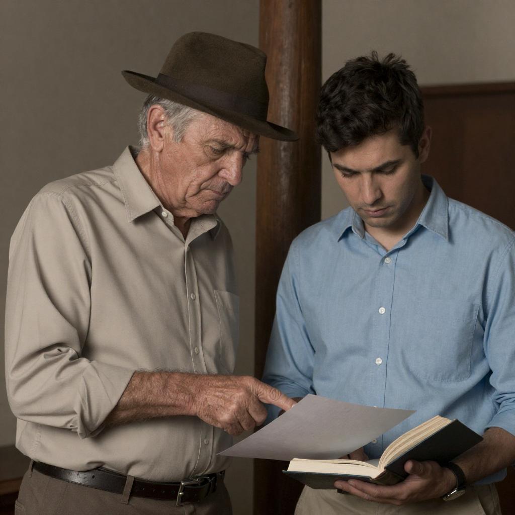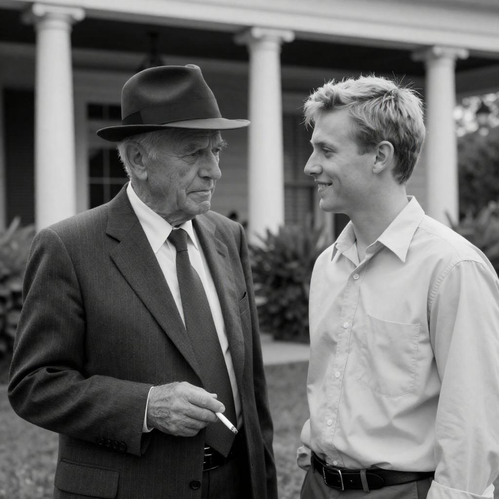 Black-and-white photograph of two men standing outside a building. Elderly man on left wears hat, suspenders, and light shirt, holding a gun in his right hand. Younger man on right in dark shirt, holding a camera, looking ahead. Both men stand near a door, the older man leaning against a pillar. Elderly man's expression is serious. Younger man's expression is neutral.