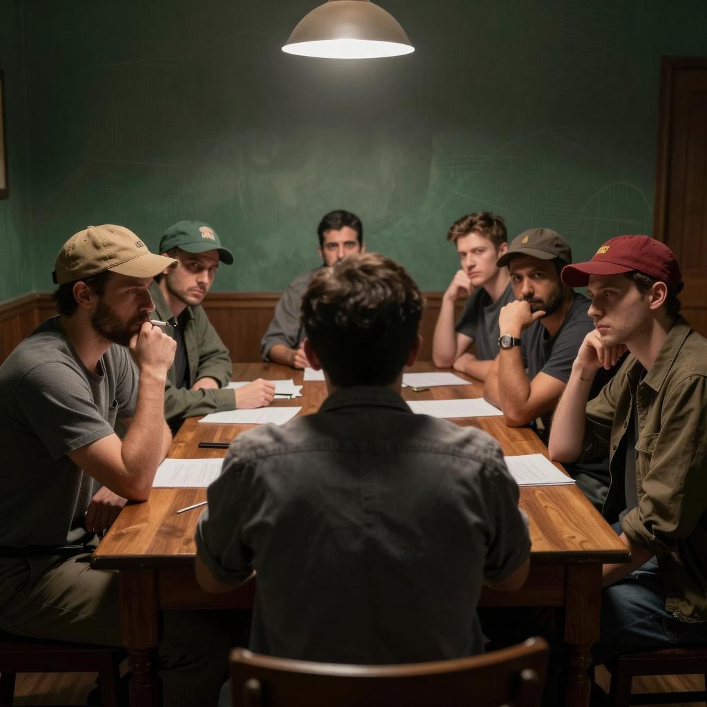 Six men sit around a dark wooden table in a dimly lit room. Central figure with dark back facing the camera. Four men wear hats: tan, green, red, and brown. Smoker on left, stern expressions on faces. Single overhead light. Green patterned walls. Papers on the table.