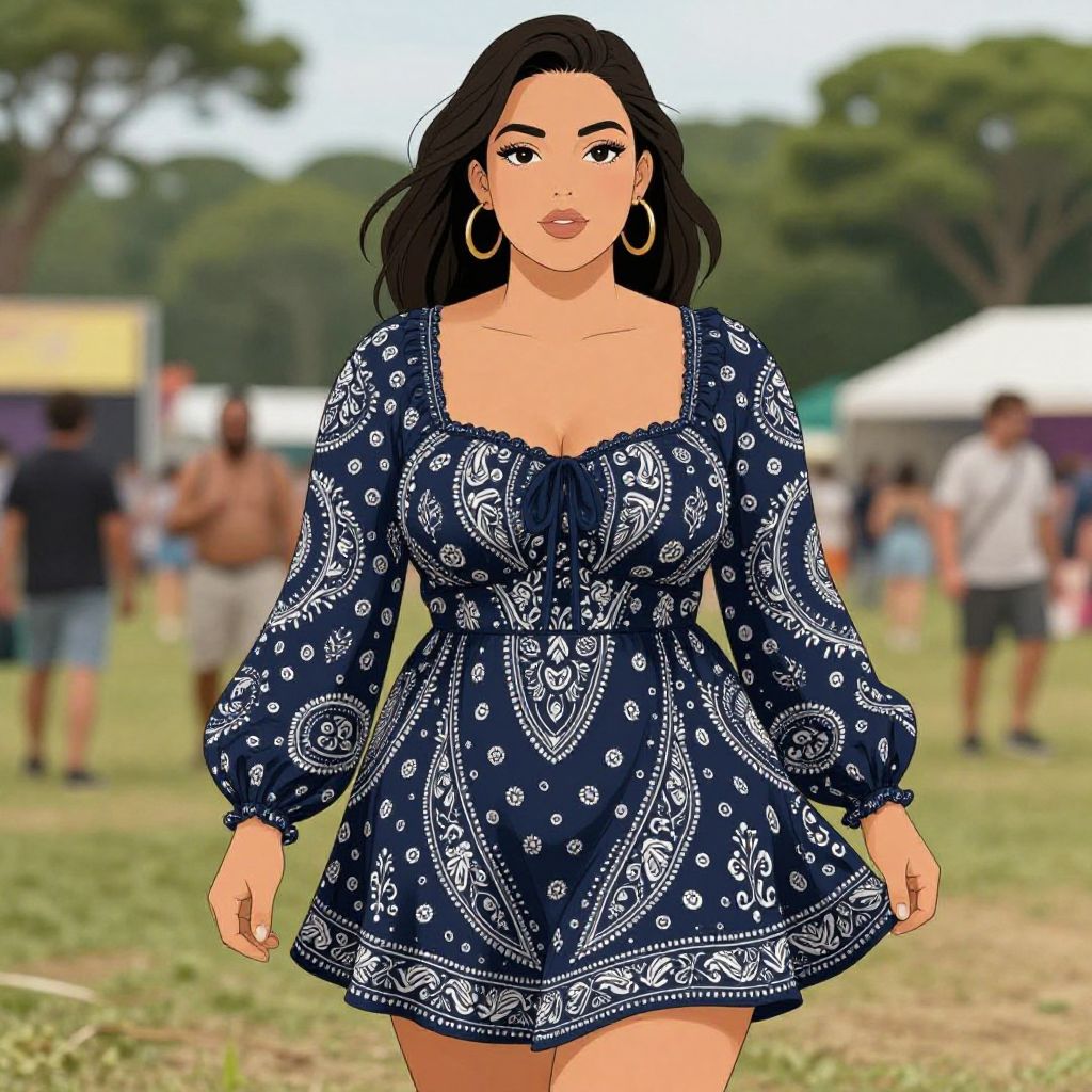 Digital illustration of a curvy woman with long black hair, wearing a colorful, patterned, bohemian-style dress, standing confidently in a vibrant