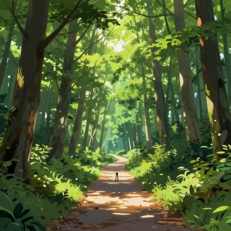 "Tripod a beautiful green forest in summer with rays of light coming through the trees, and a winding path leading off into the distance, painted concept art, anime style,"