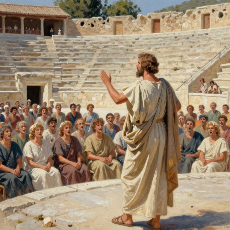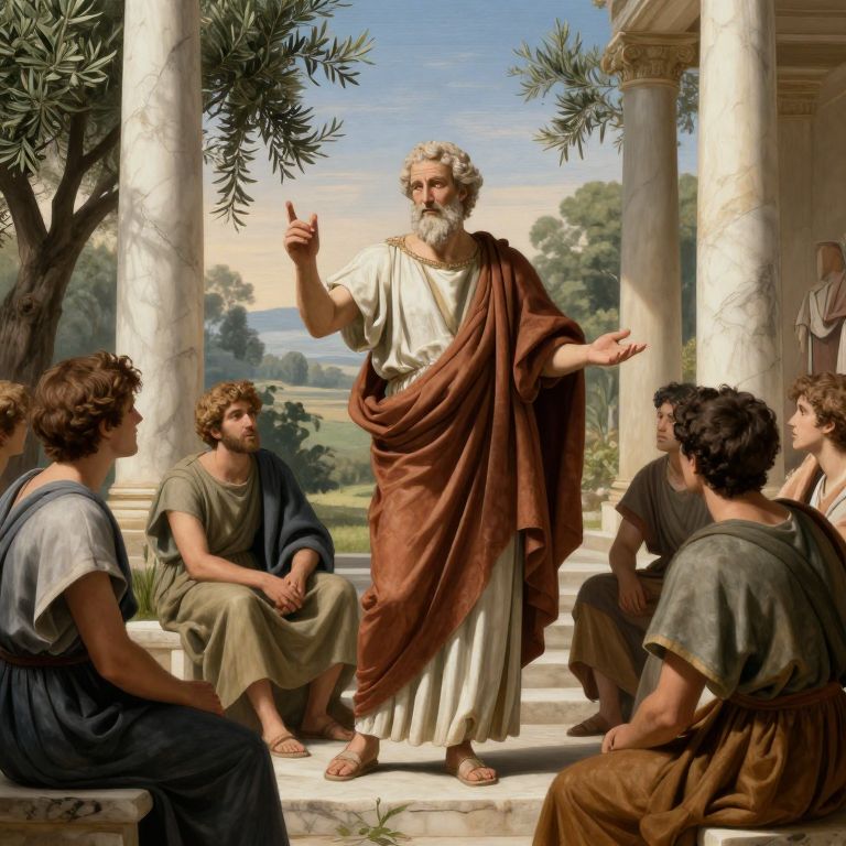 An ancient philosopher theorist in a Greek agora, debating with students under the open sky, marble columns and olive trees in the background, dressed in traditional robes, classical renaissance art style with rich textures and detail.