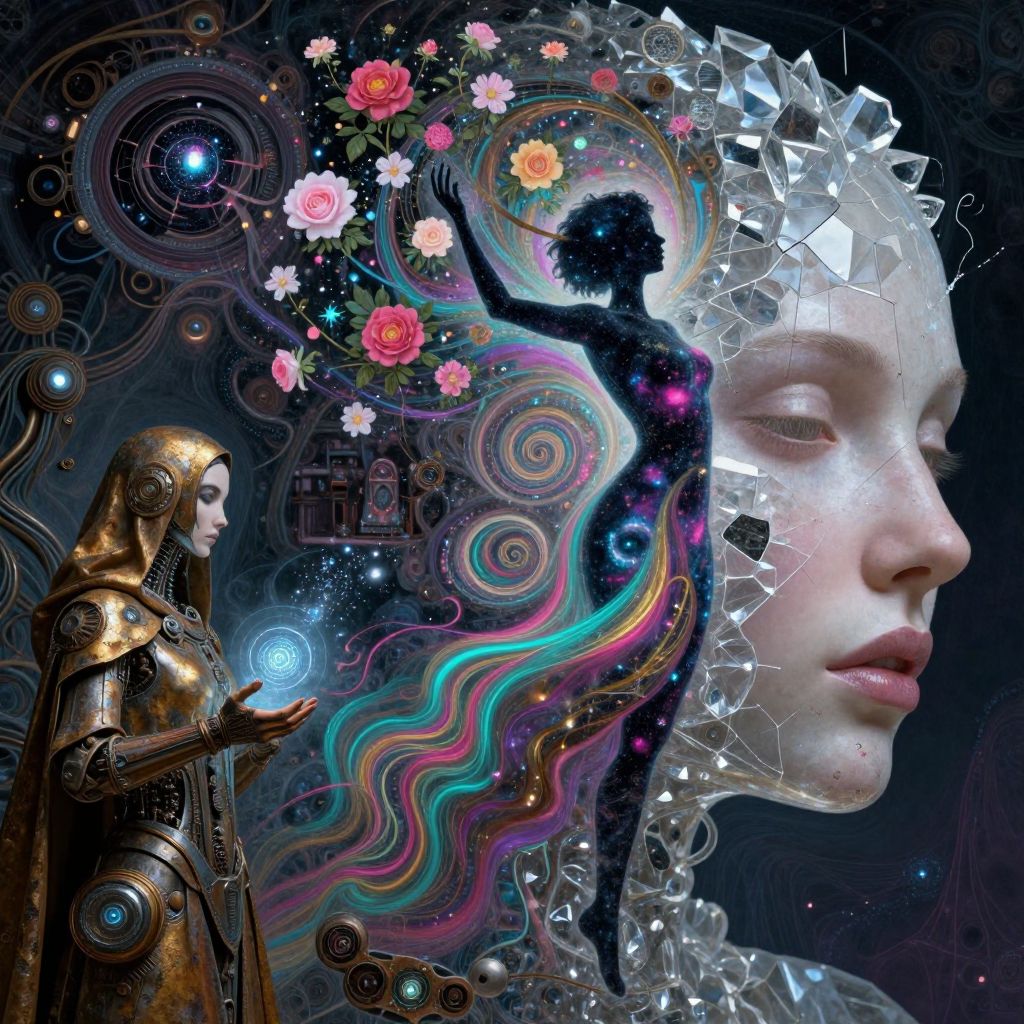 ((masterpiece, high quality, best quality, 8k, wallpaper, fine lineart, highly detailed, absurdres)), cinematic photo magical style land art style hyperrealistic, ( vaporwave:1.3), vivid colors, intricate details, realistic style, oil paintings, acrylic paintings, watercolor paintings, digital illustrations, mixed media pieces, sculptures casting shadows, cosmic sky, photorealistic, extreme detail, lifelike, crisp, precise. natural materials, outdoor, detailed blend of organic and magical elements, futuristic, legendary, detailed, intricate, (skin texture:1.3), ( Vitiligo), film, bokeh, professional, 4k, in the style of art, colorful, phone wallpaper, DTelepath Communicator - Psychic Ambassador Corps: A gifted empath facilitating diplomacy between species incapable of verbal communication. Must overcome linguistic barriers, societal prejudices, and occasional mind-reading mishaps during delicate negotiations