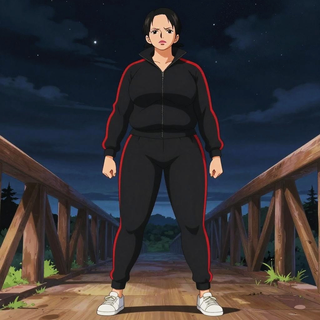 A lanky woman in a sporty casual black tracksuit with red piping, standing on a rustic bridge under a starlit sky, inspired by the visual style of One Piece. Sexy. Pretty face and beutiful eyes