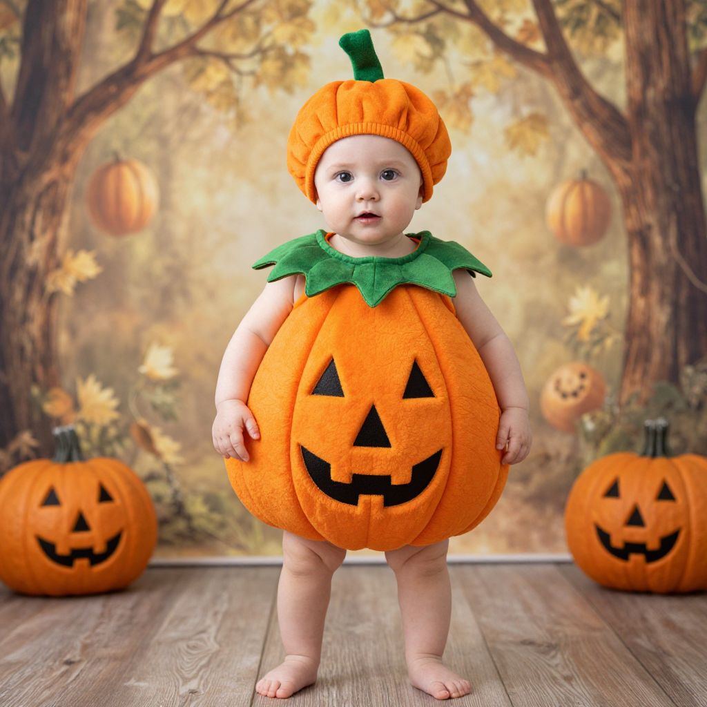 Photograph of a baby in an orange pumpkin onesie with green leaf collar, pumpkin hat, standing on wooden floor, surrounded by carved pumpkins and