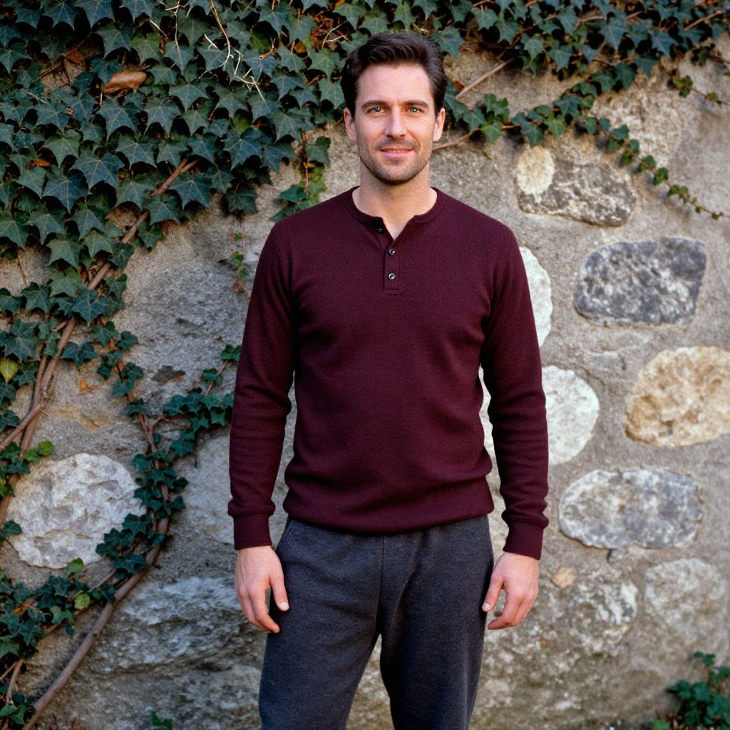 A man, thermal henley shirt in deep burgundy, brushed fleece jogger pants in dark gray, cozy and warm, rustic stone walls, ivy-covered facade, kodachrome analog film, relaxed smile, casual chic vibe. Man has masculine face and piercing eyes