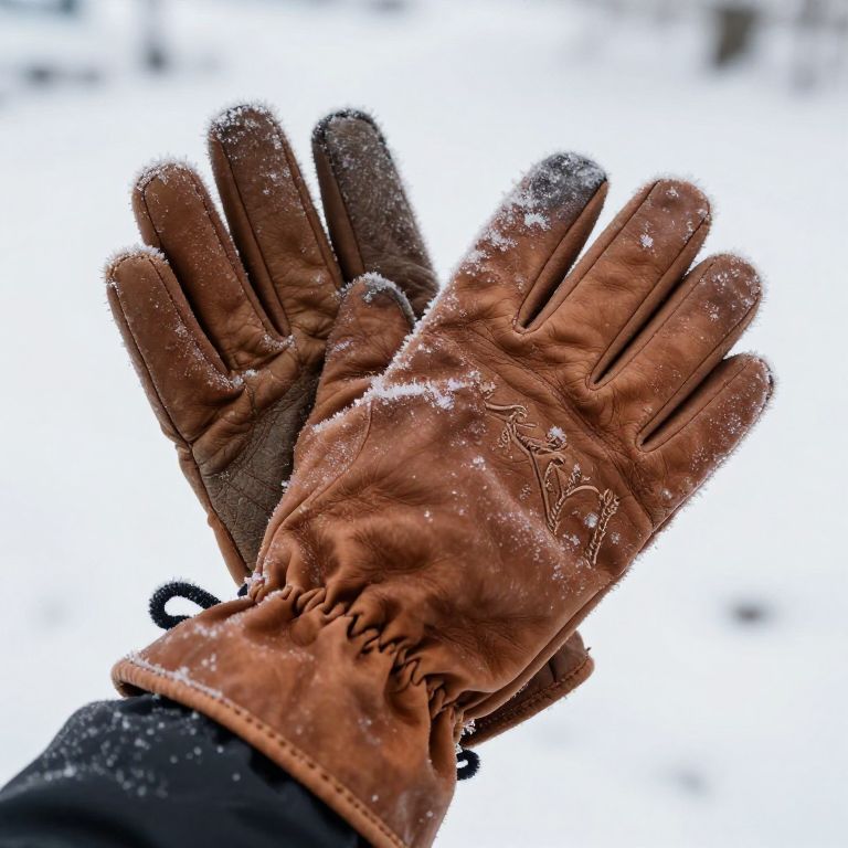 Leder gloves in snowy winter scene, frost on leather surface, subtle embroidery detail, soft diffused light, cold atmosphere with muted colors, strong contrast between warmth of leather and chill of environment