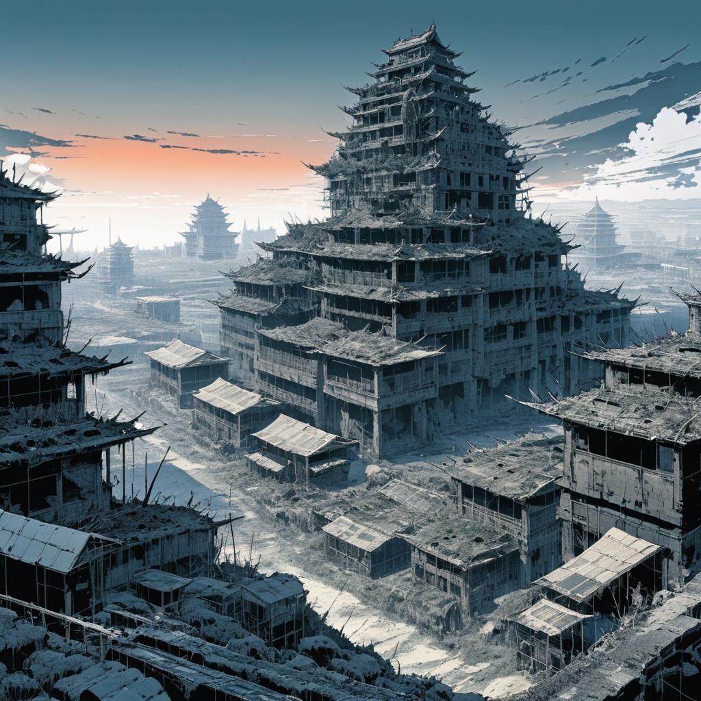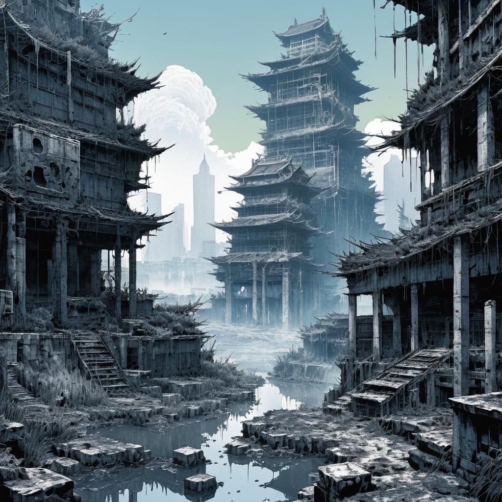 Post-apocalyptic Manga Landscape with Ruined Asian Architecture