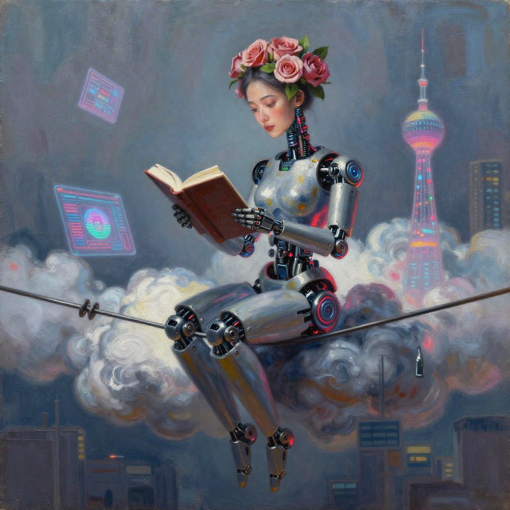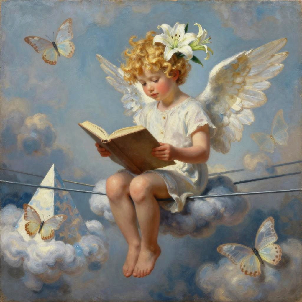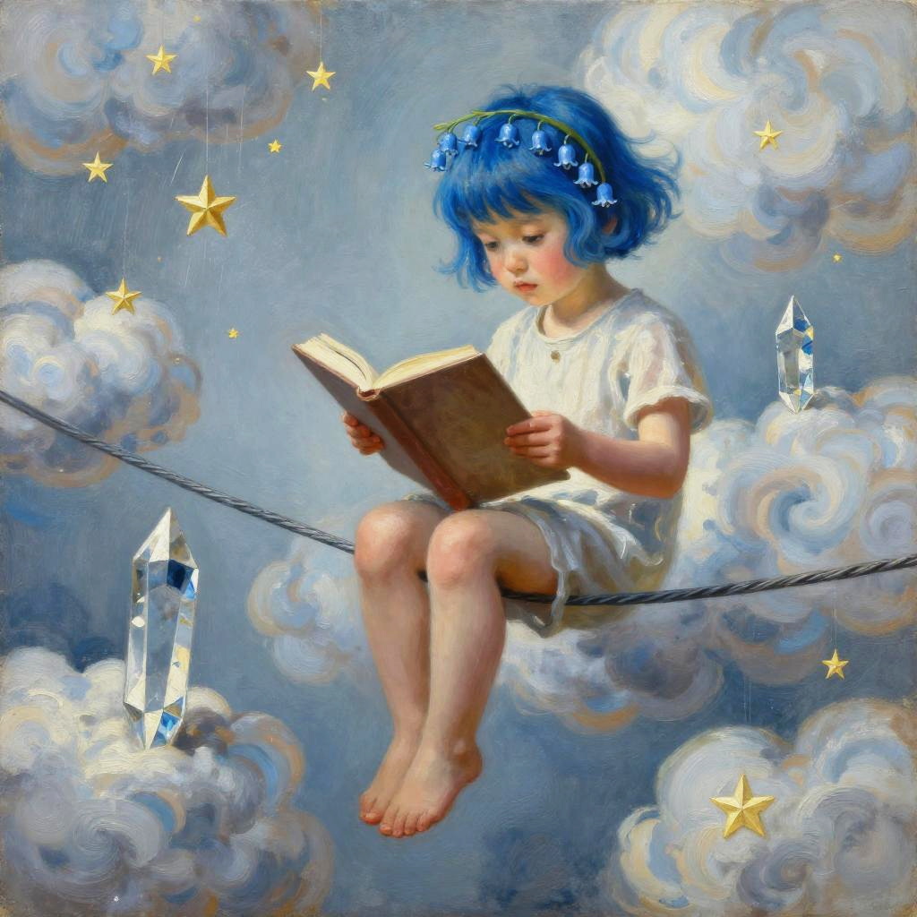 A surrealistic oil painting of a bearded man sitting on a steel wire in the air, reading a book, with flowers in his hair, surrounded by clouds and surreal elements like a single black sheep and a tower