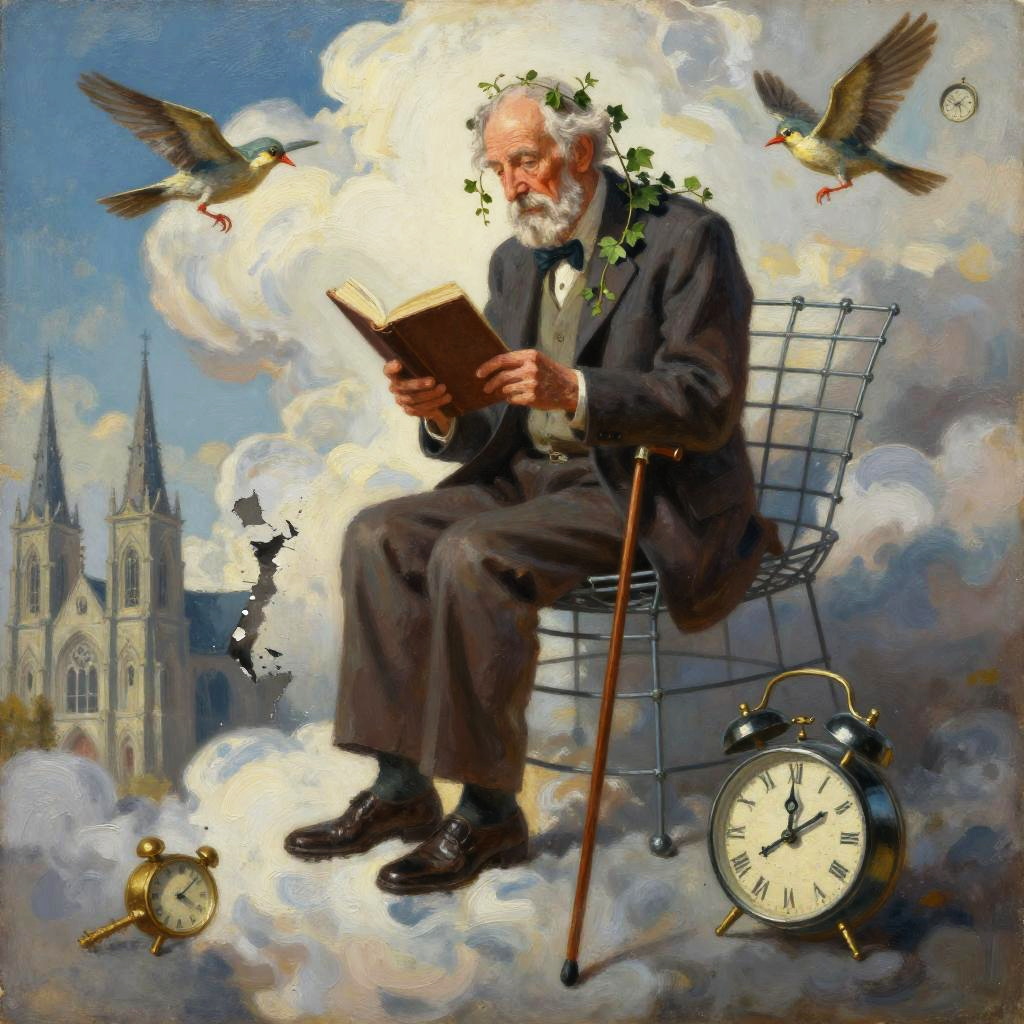 A surrealistic oil painting featuring a bearded man in a black suit sitting on a steel wire chair suspended in the air, reading a book. The man wears a floral crown and is surrounded by whimsical clouds with surreal elements such as a black sheep-shaped cloud, floating towers adorned with flowers, and additional miniature figures also reading. The background shows a vast rural landscape with fields and a single white sheep, blending elements of fantasy and reality.
