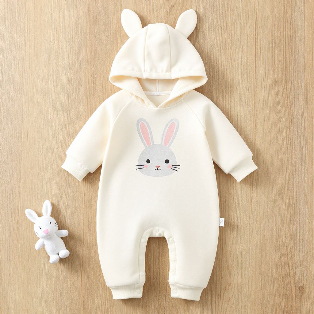 Photograph of a cream-colored, hooded baby onesie with rabbit ears and a white bunny graphic on the chest, laid flat on a light wooden surface. The onesie features a simple, cute design with a cartoon-style bunny face. To the left of the onesie, there is a small, white plush toy rabbit with pink inner ears. The background is a smooth, light-colored wooden texture, providing a subtle contrast to the creamy fabric of the onesie. The image is brightly lit, emphasizing the soft texture and clean lines of the outfit.