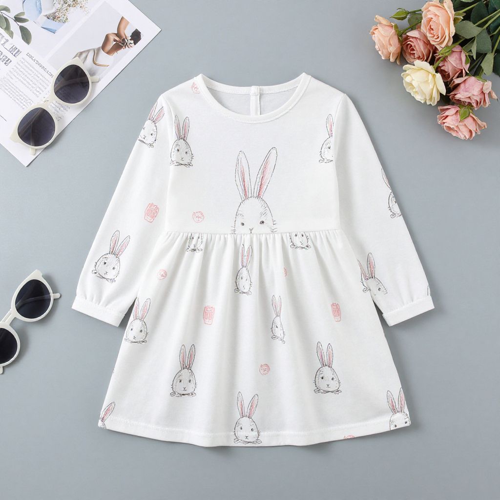 Photograph of a white hooded onesie with bunny graphic and matching plush bunny, laid flat on wooden surface.
