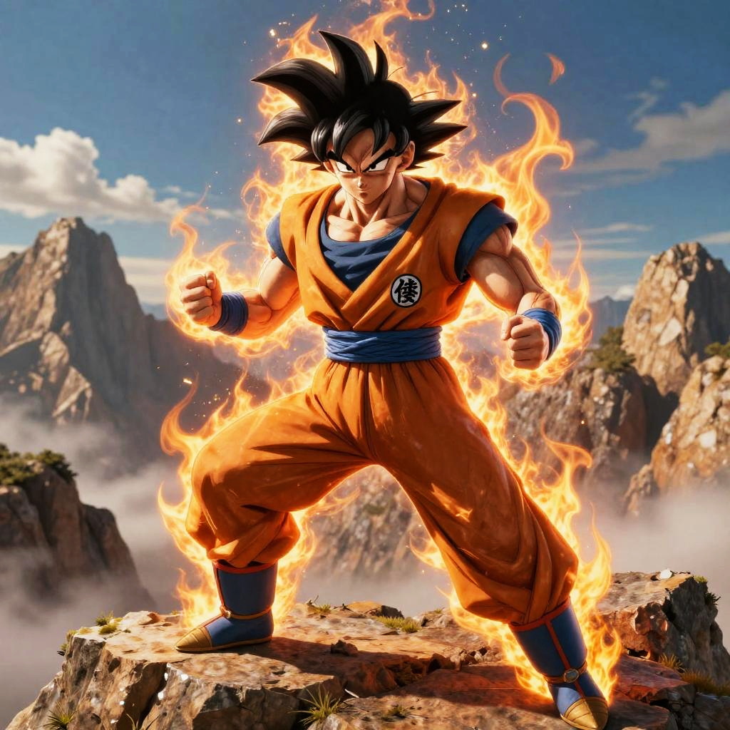 Digital art: Goku with angel wings, orange gi, and flaming fist, leaps from open book over cityscape at sunset, birds flying.
