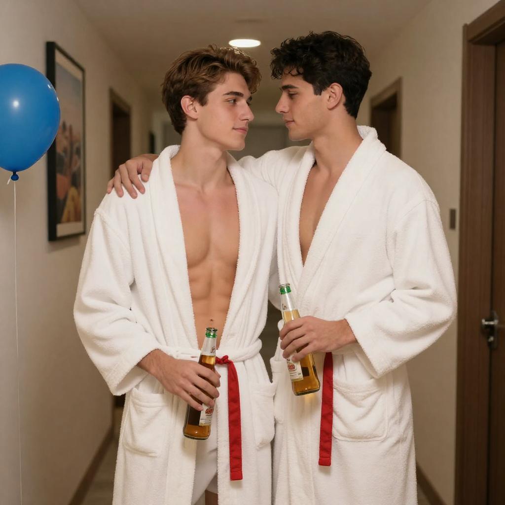 Photograph of two young men in a hallway, both wearing white bathrobes with red s. The man on the left is shirtless, showing a lean, muscular build, and holds a beer bottle. The man on the right, with short dark hair, embraces him from behind, also holding a beer bottle. The hallway has beige walls with framed pictures and a blue balloon on the left.