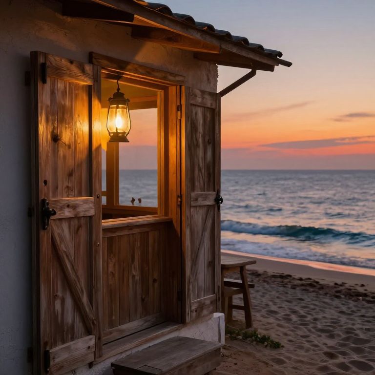 Shuttered seaside cafe at dusk, rustic wooden panels closed tightly, warm lantern glow flickering inside, gentle ocean breeze, sandy path leading to the shore, vibrant sunset colors reflecting on water, nostalgic and cozy vibe, painterly texture