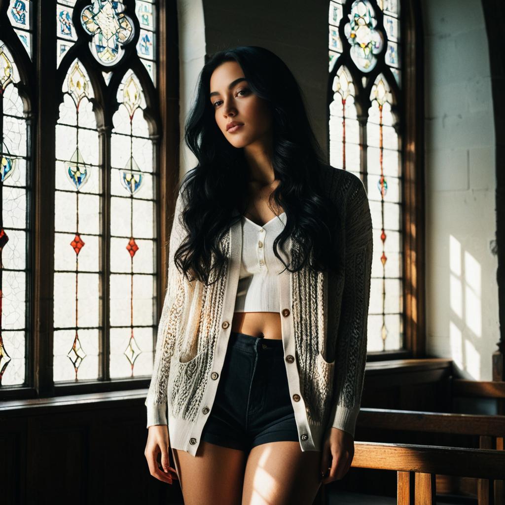 A stunning woman with long wavy black hair, soft makeup, full lips, and smooth skin, framed by stained glass windows in an old chapel, wearing a sheer longline cardigan over shorts, warm natural light casting soft shadows.