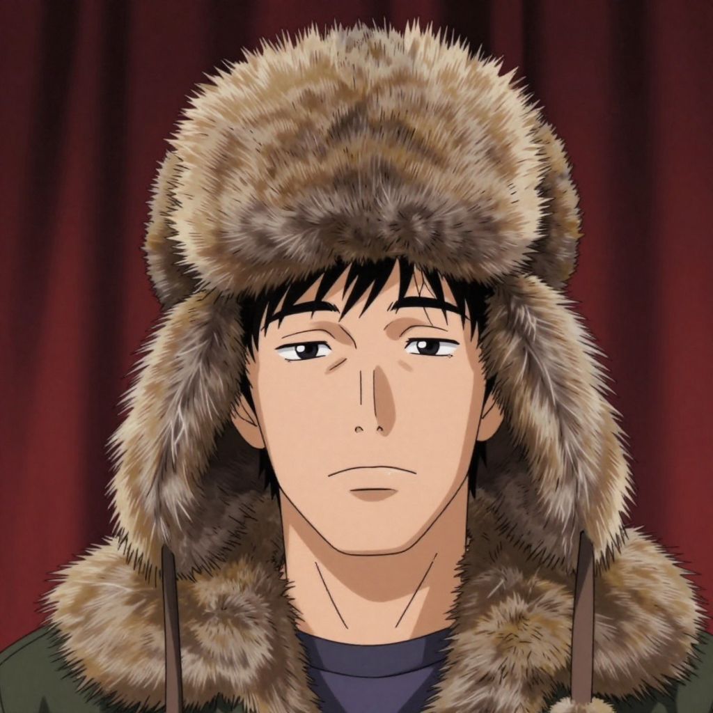 This digital anime-style drawing features a young man with pale skin, black hair, and dark eyes, wearing a large, brown fur hat with ear flaps and a matching fur-trimmed coat. The background is a solid, dark red curtain. The fur has a realistic texture with shades of brown and beige, while the man's expression is neutral, with slightly parted lips and a straight gaze. He has a slender build and is depicted from the chest up. The style is clean and detailed, characteristic of modern anime portrait art.