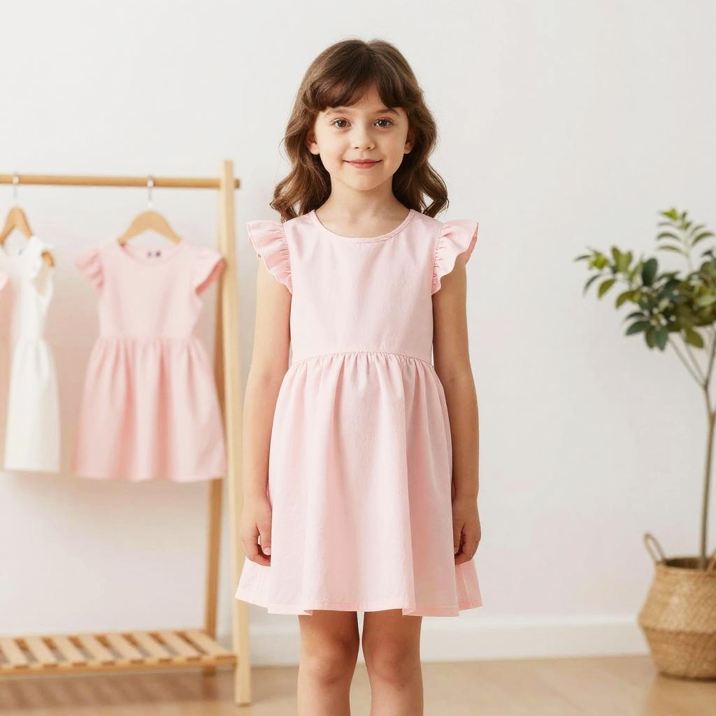 A young girl with long brown hair, wearing a light pink designer dress featuring embroidered floral patterns on the bodice and ruffled sleeves. She is smiling and standing indoors near a wooden clothing rack with other pink dresses hanging on it, and a beige armchair is visible in the background.