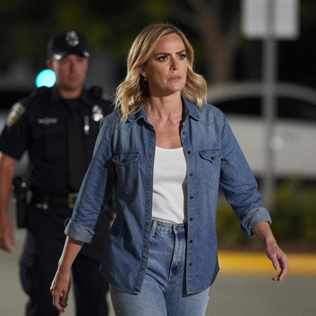 A woman with shoulder-length blonde hair, wearing a dark blue blazer, white t-shirt, and dark pants, sitting on a wooden bench in a prison cell. She looks down with a neutral expression. A stack of white bread loaves is blurred in the foreground. A uniformed man with a blue shirt and black tie is partially visible on the right. Metal bars fill the background.