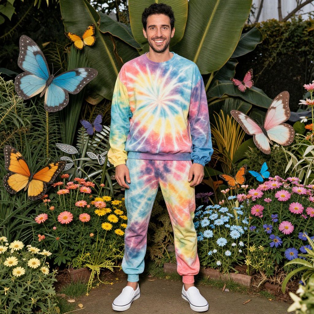 A man, tie-dye sweatshirt, relaxed-fit joggers, slip-on canvas shoes, lightweight windbreaker, vibrant hues, colorful butterfly garden, hand-tinted photograph, joyful expressionMan has masculine face and piercing eyes