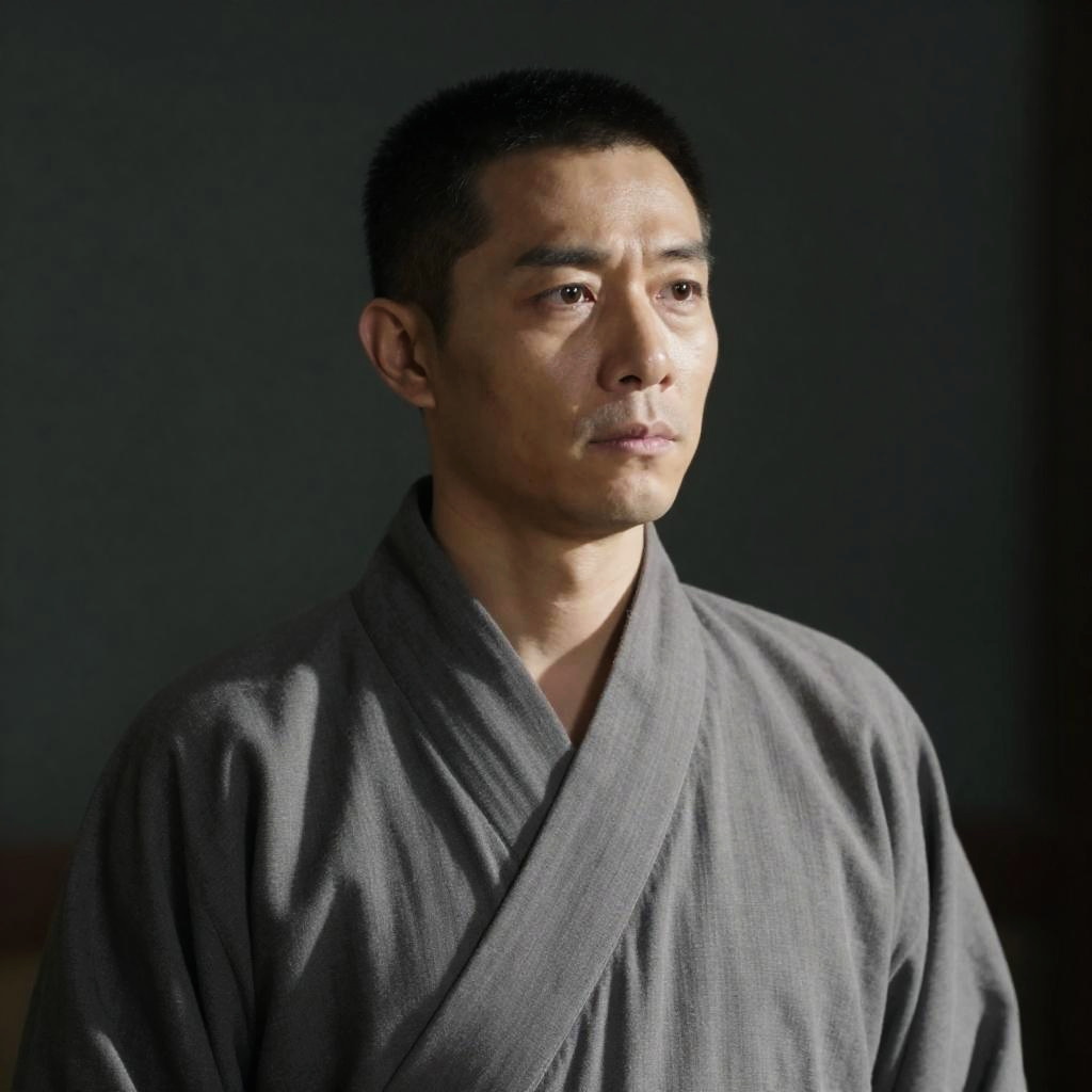 Asian man with medium skin tone, dark hair, wearing a wide-brimmed straw hat with a white chin strap, black kimono. He holds the hat with his right hand, serious expression, close-up shot. Background is blurred greenery.