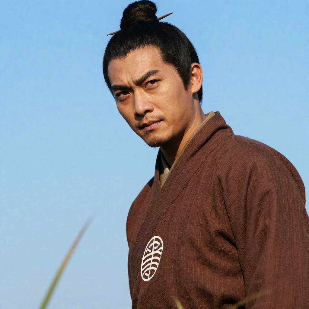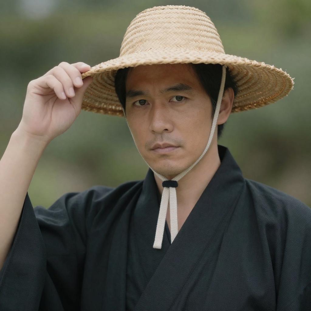 Close-up portrait of an Asian man with medium skin tone and dark hair, wearing a wide-brimmed straw hat with a white chin strap and a black kimono. He holds the edge of his hat with his right hand, displaying a serious expression. The background features blurred greenery.