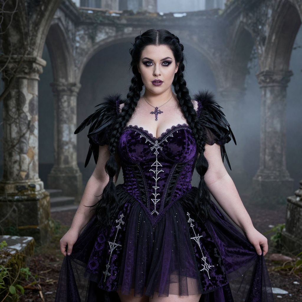 Photorealistic portrait of a strong, beautiful plus-size woman with long, braided black hair and a sharp, intelligent face with high cheekbones and a cold yet dreamy gaze, dressed in a luxurious plus size goth fairy costume — combining dark purple and black velvet with delicate silver runes, tulle petticoats, and ornate, feathered wing sleeves — standing in an abandoned castle garden at night with fog drifting through crumbling stone arches.. The woman has big tits and cute face