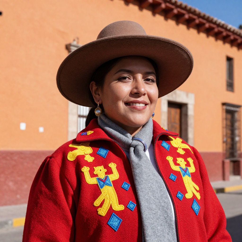 Woman wearing traditional Guatemalan attire, including a wide-brimmed brown hat, vibrant red jacket adorned with yellow figures and blue diamond patterns, and a gray scarf, smiles warmly against a backdrop of sunlit orange buildings in Todos Santos.