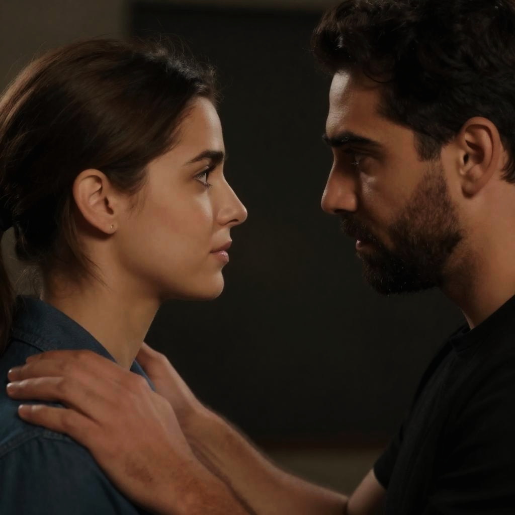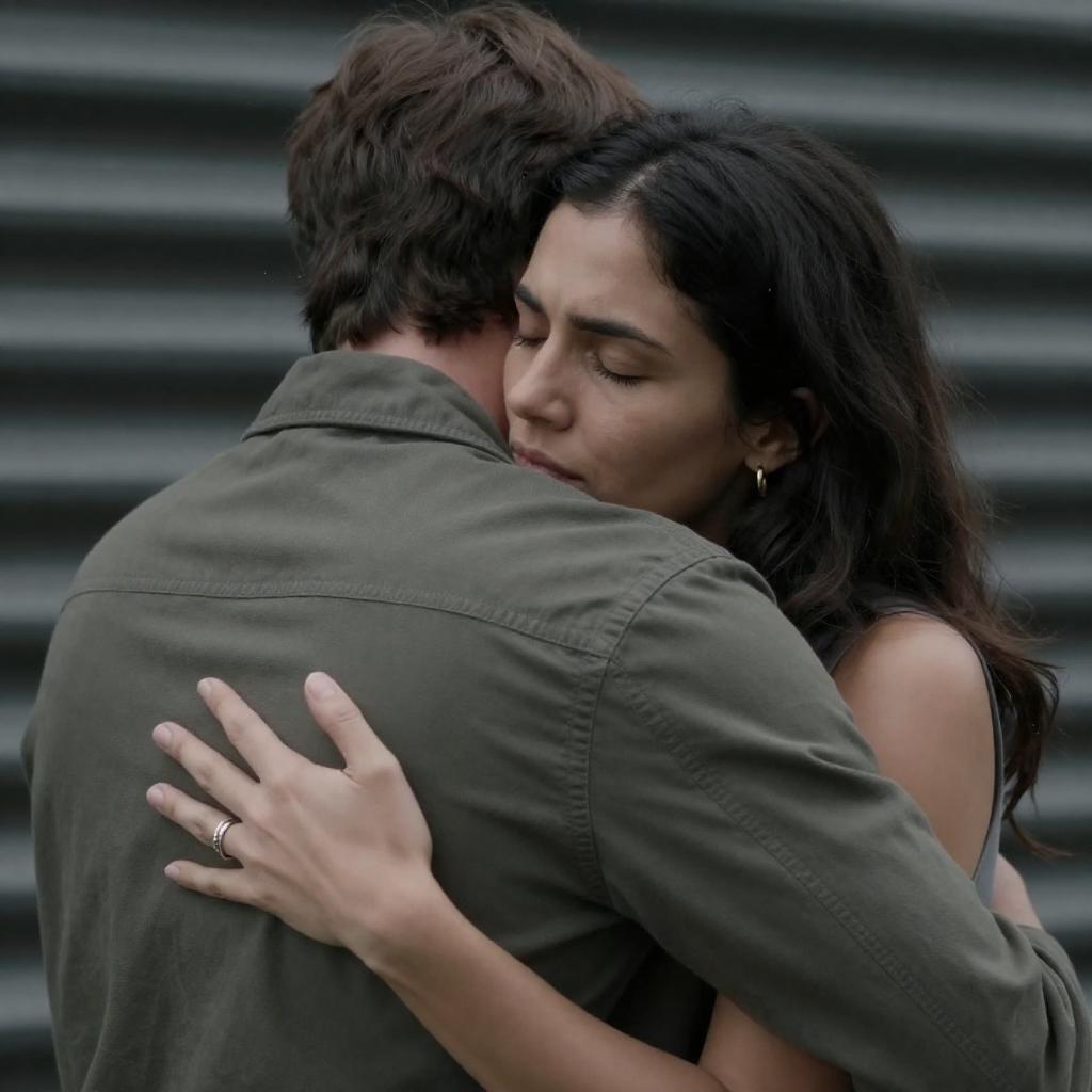 Photograph of two people hugging. Woman with long brown hair, smiling, wearing a purple shirt, hugs a man from behind. Man has short dark hair, wears a red shirt, holds a candy bar in his right hand. Background is blurred with colorful lights. Woman's left arm around man's shoulders, man's back to camera. Both smiling.