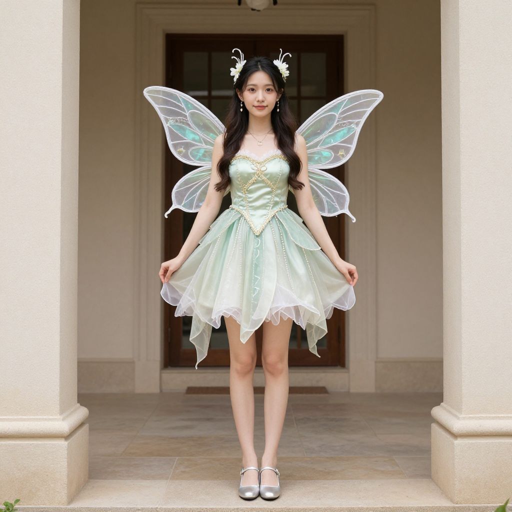 Asian woman with long black hair, white fairy wings, and butterfly headpiece, wearing a sparkling green dress, stands on a stone porch. Photoreal