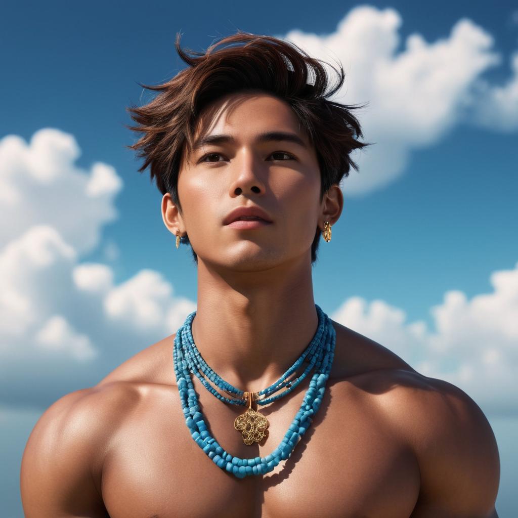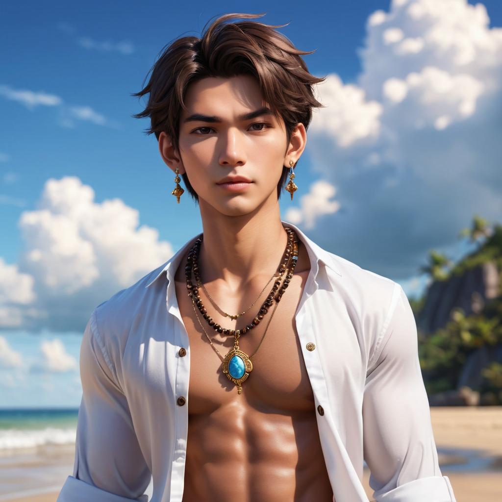 Portrait of a young man with medium skin tone and dark brown hair wearing multiple necklaces and an open light blue shirt, standing on a sandy beach with a blue sky and clouds in the background.