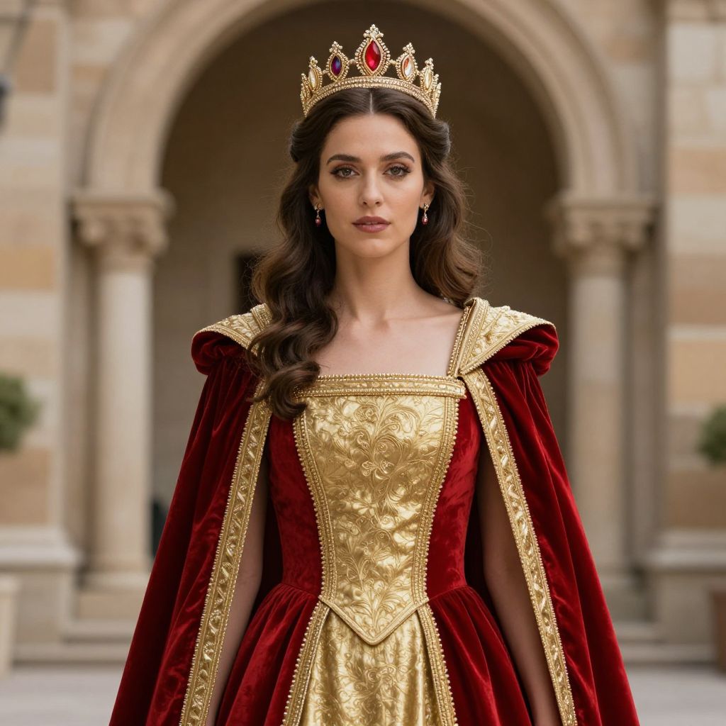Photograph of a fair-skinned woman with long, wavy brown hair, standing in front of a stone archway. She wears a gold and red velvet gown with intricate gold embroidery, and a gold crown adorned with red gemstones. Her expression is serious, and she looks directly at the camera. The background features beige stone walls and greenery. Her dress has puffed sleeves and a square neckline, adding to the regal appearance. The image has a realistic, cinematic style, evoking a medieval or fairy-tale theme.
