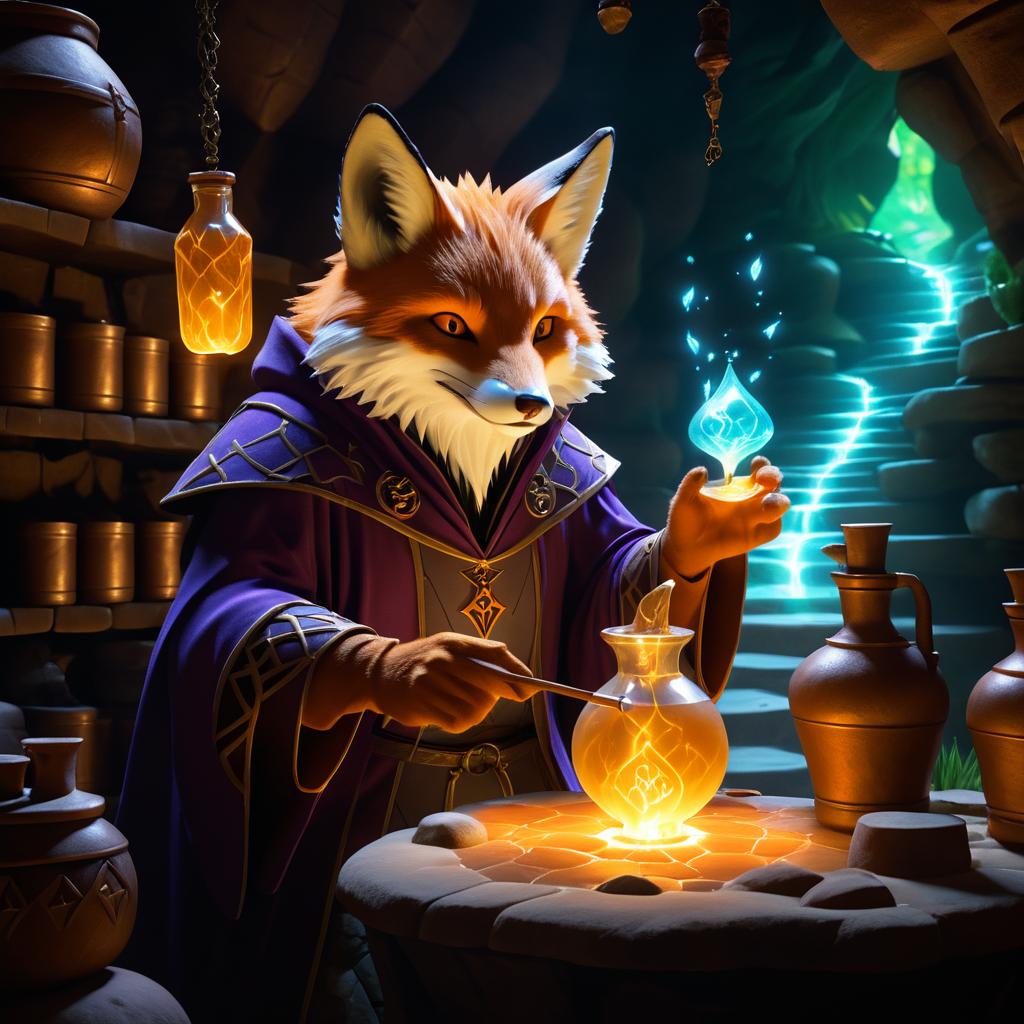Anthropomorphic fox alchemist brewing a potion in a hidden cave. Styled as cinematic Magic: The Gathering artwork with volumetric lighting by Greg Rutkowski.
