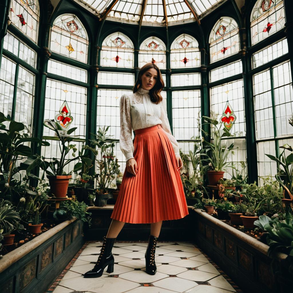 Woman in Versace hi heels boots, color photo by gaia rodsier, wearing ivory lace high neck blouse with pleated coral midi skirt, in quaint victorian greenhouse with stained glass windows, high-fashion editorial, cinematic lighting, full-body shot, elegant pose, sharp focus, rich textures, glossy magazine aesthetic.
