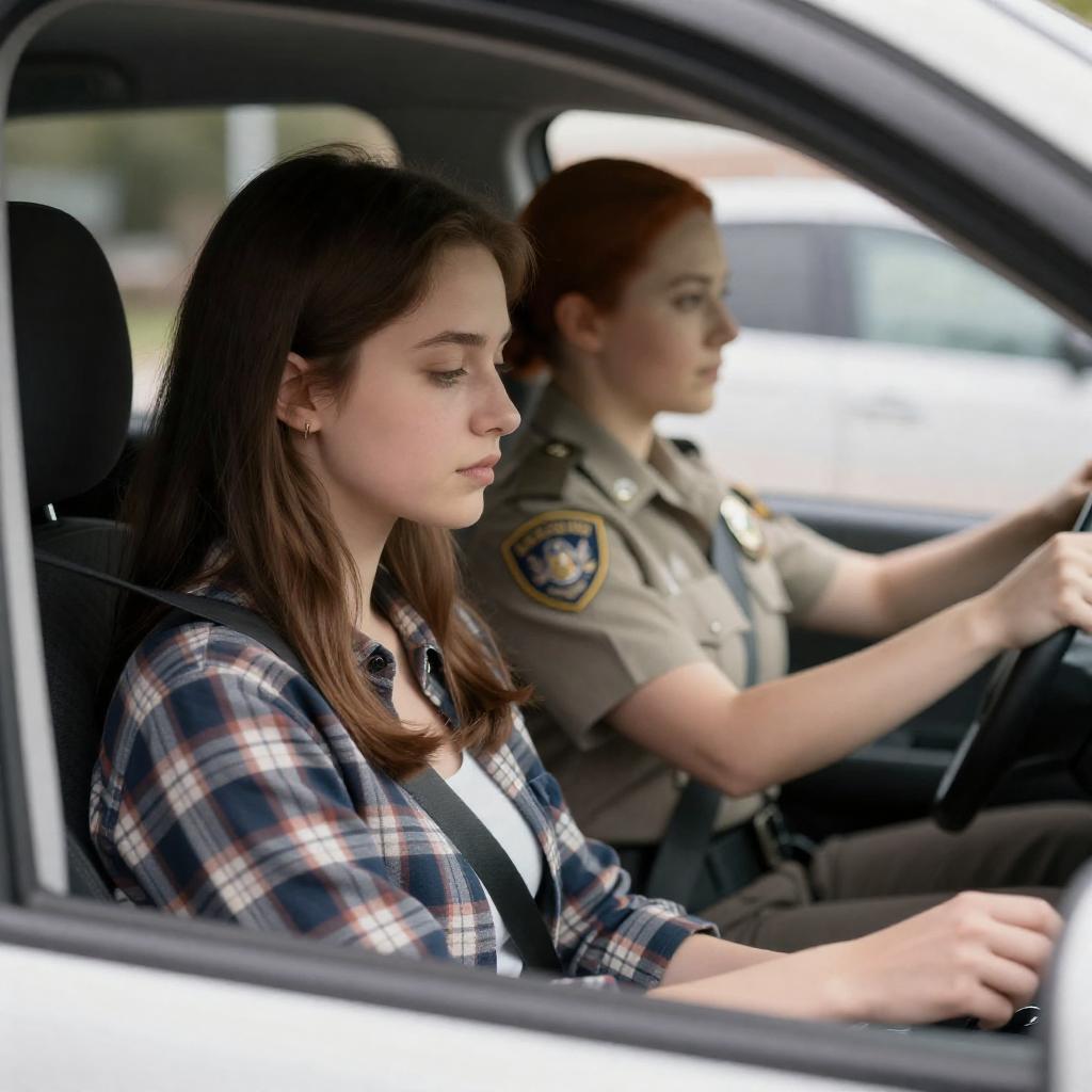 Photograph of a woman with blonde, wavy hair, bound at the wrists with a rope, sitting in a car's driver's seat. She wears a grey t-shirt and blue jeans, looking distressed. Her right leg is raised and bent. Car's interior visible, including door and dashboard. Background shows blurred outdoor scene with a road.
