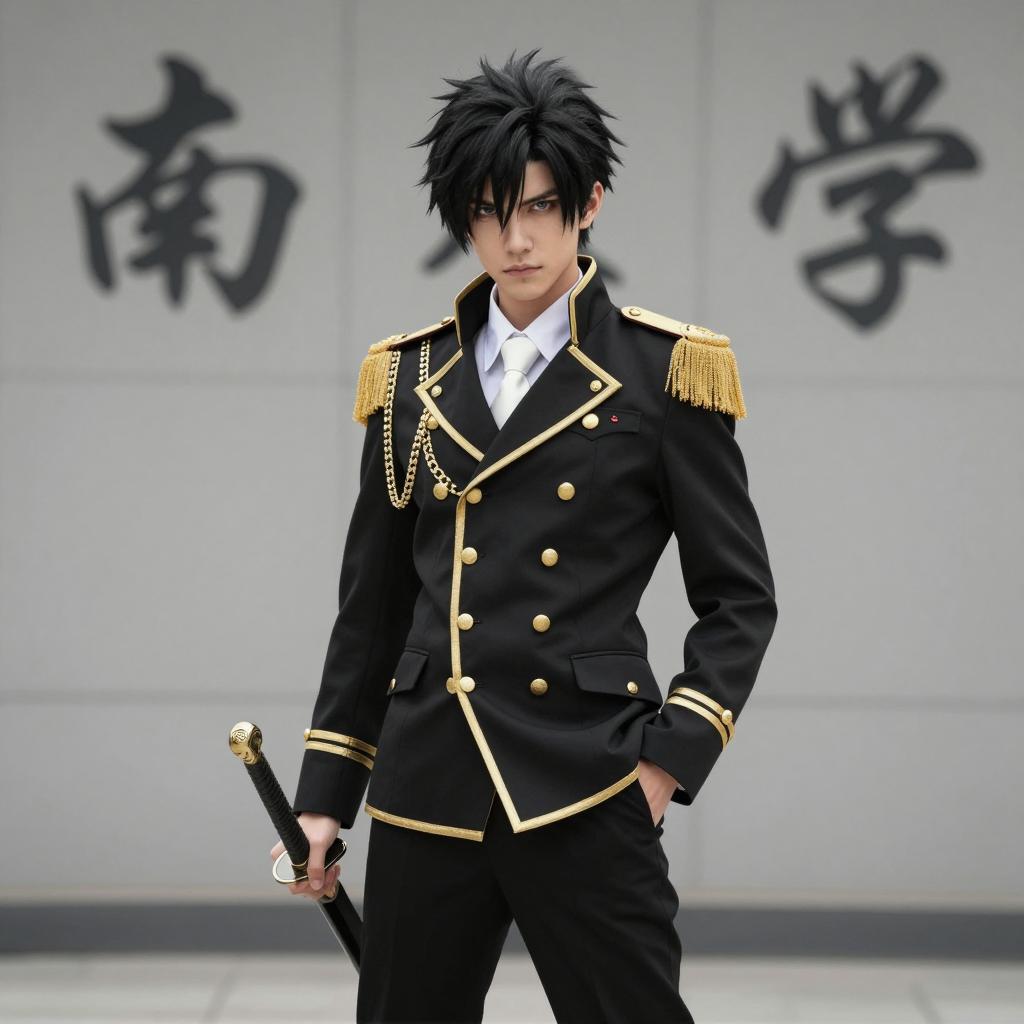 Male with black spiky hair, wearing black and gold military-style jacket with gold buttons, black pants, white necktie, holding a sheathed sword in his right hand, standing against a ured gray wall with Chinese characters. Intense gaze, slightly turned head. His left hand is in his pocket. Photography.