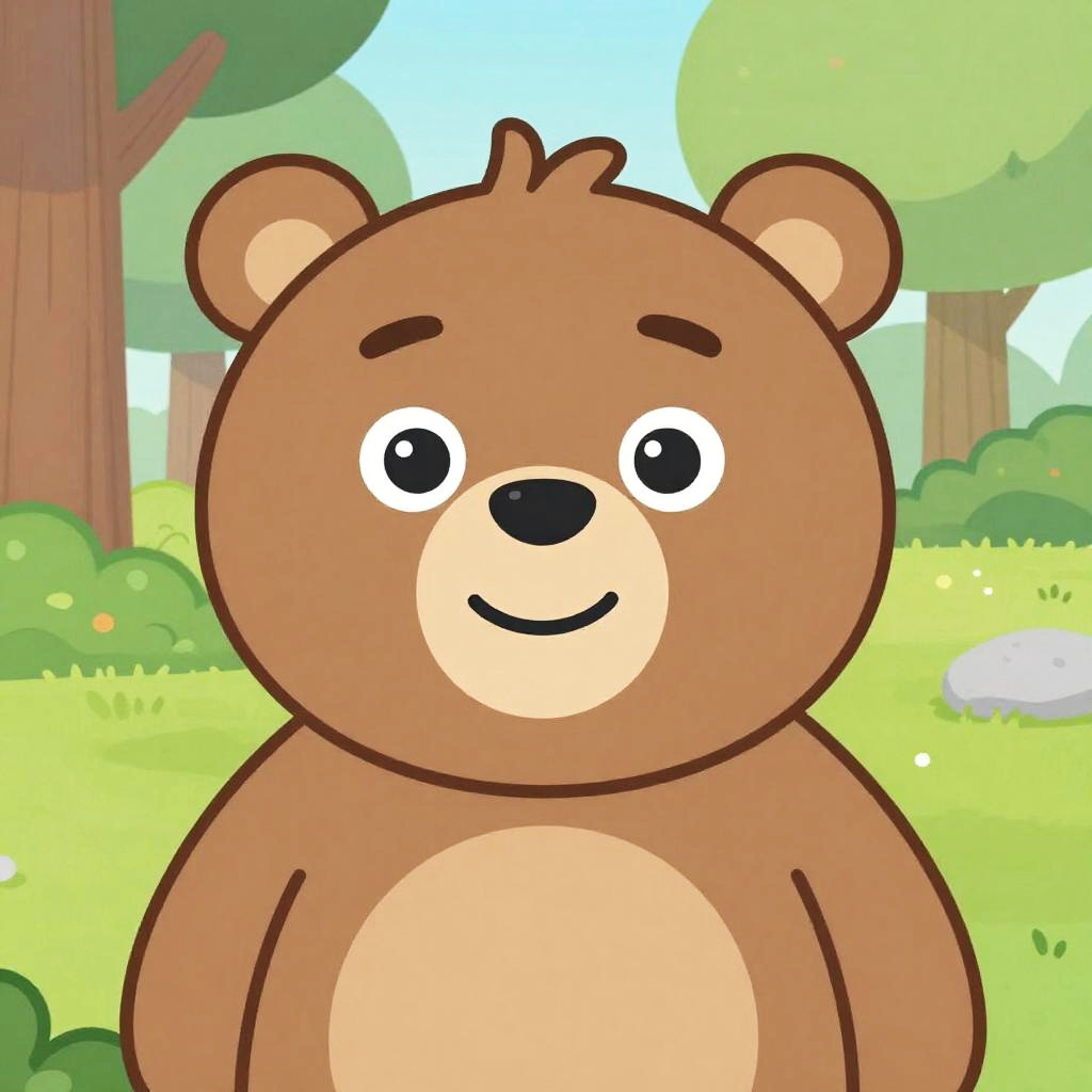 A digital cartoon illustration of a cute, brown teddy bear with a light beige belly and black nose. The bear has large, round, white eyes with black pupils, and a small, friendly smile. Its ears are round and positioned on top of its head, with a small tuft of brown fur in the middle. The background features a vibrant, sunny forest scene with green trees, bushes, and a bright blue sky. The bear is centered in the foreground, and the background is slightly blurred, emphasizing the bear. The style is simple and colorful, with bold outlines and a playful, child-friendly aesthetic.