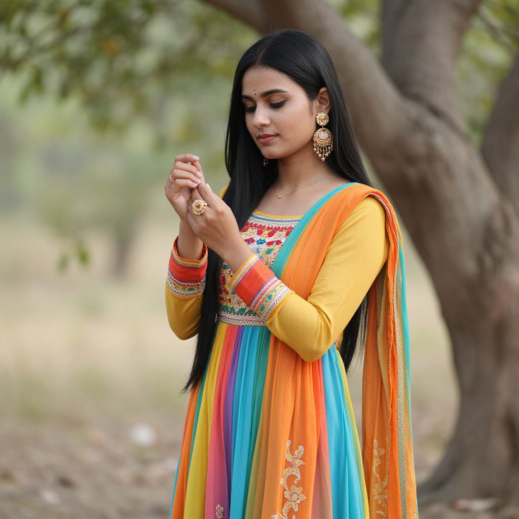 Photograph of an Indian woman with long black hair, wearing a colorful orange and blue traditional saree with intricate embroidery, standing outdoors near a tree,