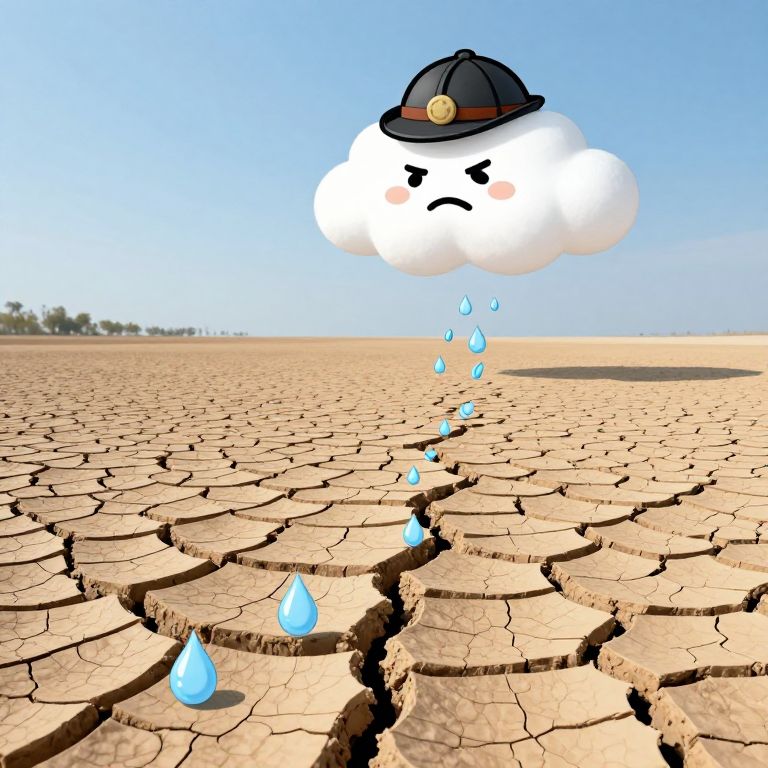 An anxious cloud wears a detective hat and follows a trail of evaporated water drops to solve a mystery of ongoing drought.